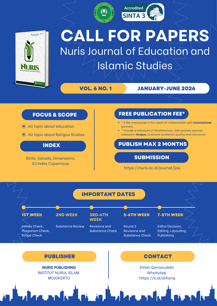 The attainment of SINTA Rank 3 is not only a recognition of our efforts but also a motivation to further improve the quality of published works, expand international collaborations, and strengthen the journal’s role in advancing scholarly discourse. We extend our heartfelt gratitude to all contributors and invite researchers worldwide to continue submitting their valuable manuscripts to Nuris Journal of Education and Islamic Studies.